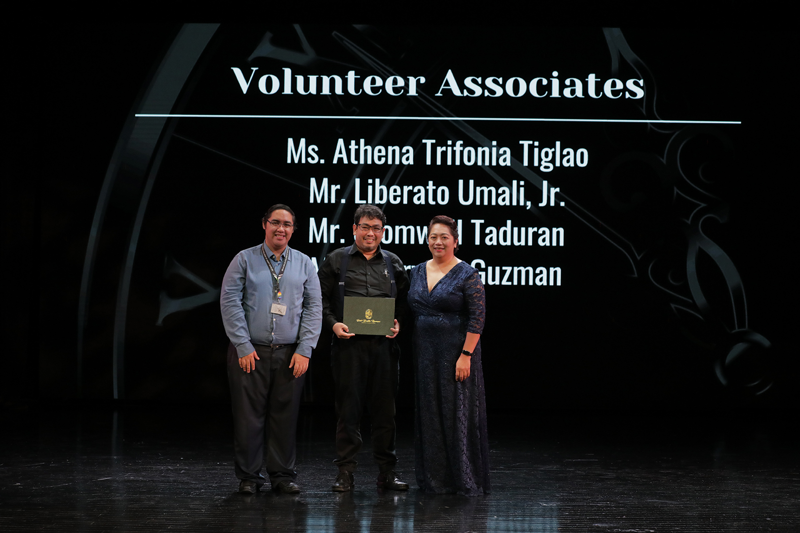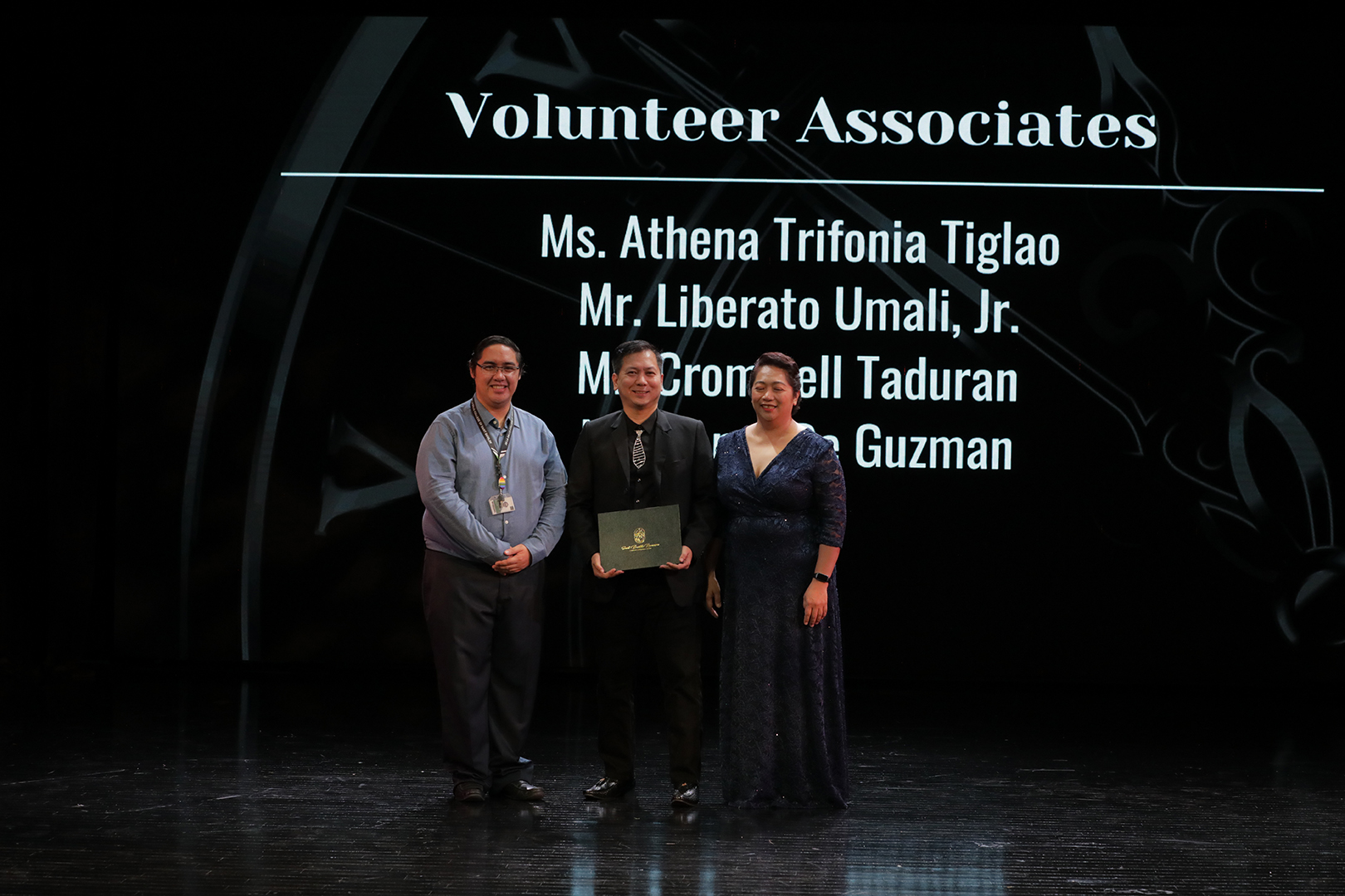 For the recognition awards for volunteers of the Benildean Community, given to the students and associates for their selfless contributions as volunteers to the Center for Social Action for AY 2022-2023 programs and activities, Ms. Chona Rodulfa, Director – People and Organization Development Office and Mr. Ron Malaluan, Head, Center for Social Action – Benildean Engagement Unit handed out certificates to the following volunteers: Jeanne Gabrielle Daza (student), Athena Trifonia Tiglao (associate), Liberato Umali, Jr. (associate), Cromwell Taduran (associate), and Henry De Guzman (associate).