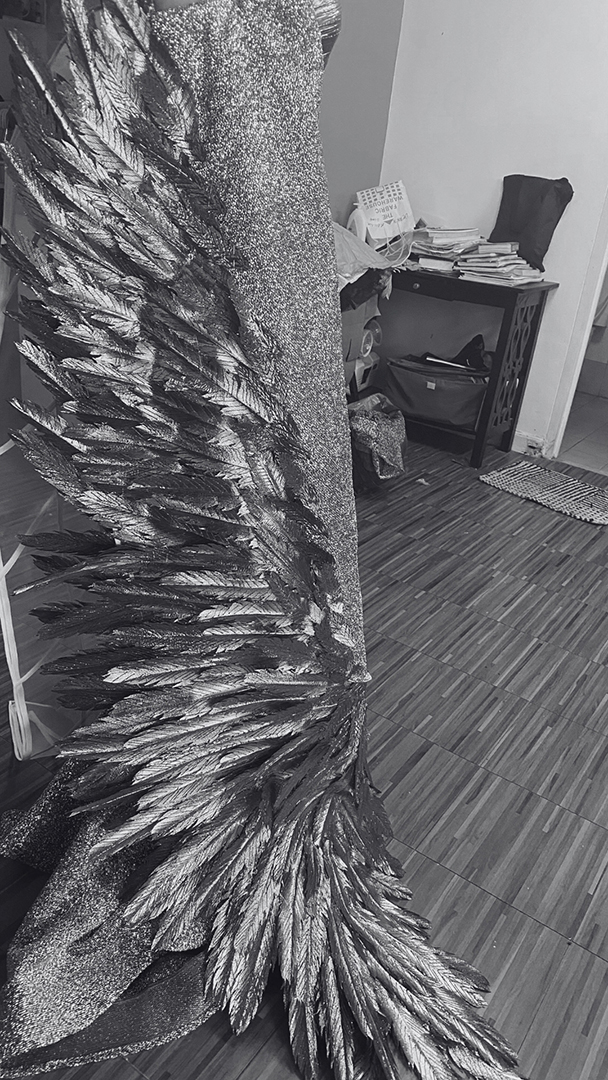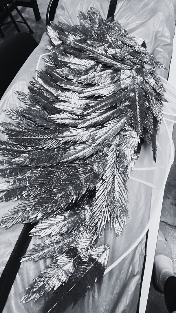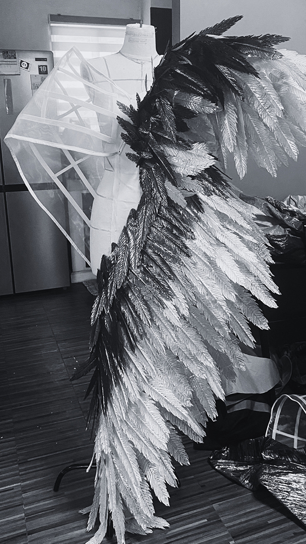 One of the gruesome challenges I faced in creating the collection was making the feathers perfect. It went through a lot of changes, from using different fabrics, using unconventional materials, and even different fabric treatments to perfect its lightweight, metallic, yet realistic look of a feather, while keeping the collection financially feasible. I remembered trying to get my feathers laser cut for potential mass production, however, it just cost too much for only an eigths of the feathers I needed for the collection. This setback put me on a traditional path of cutting, creasing, soldering the details of each individual feathers, and hand stitching each of the feathers to the base of my pieces. I want to showcase that exact hardwork and craftmanship of a couture designer through my collection, because the blood, sweat, and tears put in these pieces are what makes them truly valuable aside from its subjective beauty.