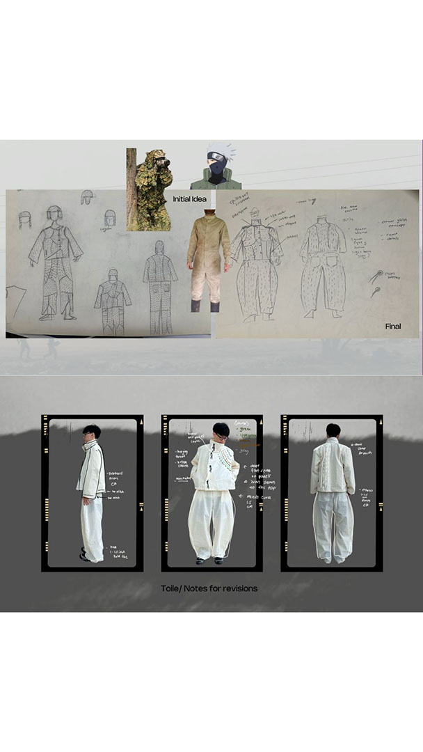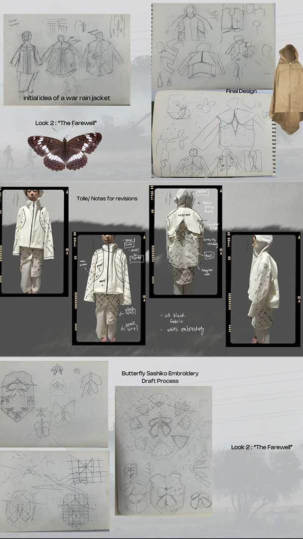 Producing the final output was the most challenging part of designing this collection, especially doing the sashiko stitching and piecing all the parts together, which made me anxious about making mistakes on the final fabric. Through this process, I learned that consistency is important and that it is okay not to be perfect, as restarting from the beginning only consumes more time. By staying true to my vision while keeping an open mind to the feedback and revisions given by my mentors, I was able to balance this challenge. I realized that taking feedback negatively can hinder progress, while asking for guidance when things are not working helps in the long run. As long as I could clearly defend what I envisioned for my work and overall look, it became easier to improve my work without losing my original vision.