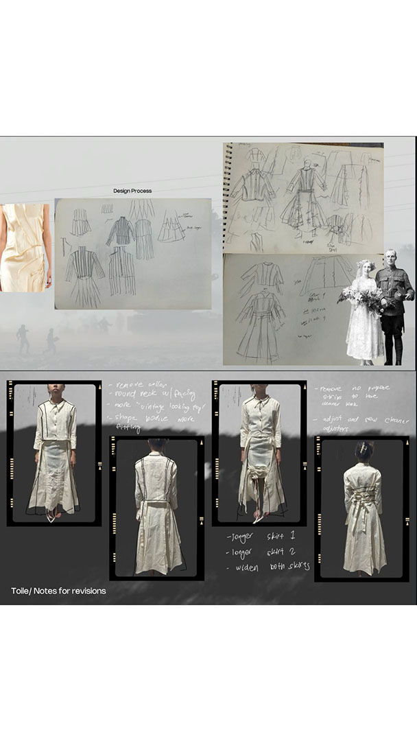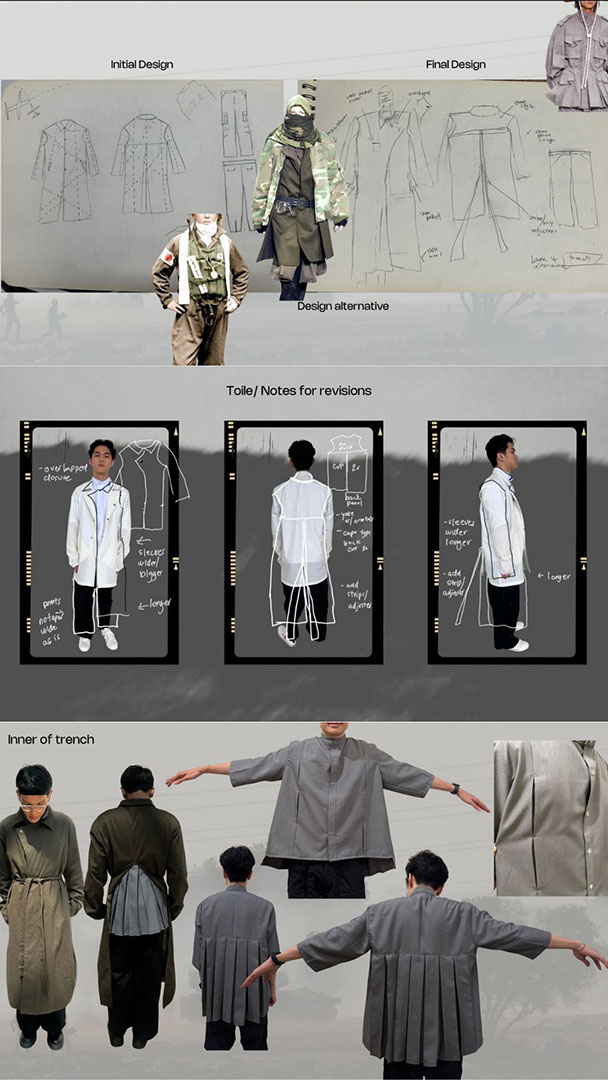 Drawing narrative inspiration from the film Atonement, this ready-to-wear collection explores a wartime love story with both happy and tragic possibilities. It tells the story of a soldier’s resilience and yearning for homecoming, using World War-era uniforms from diverse countries and eras as a starting point. Experimental designs prioritize wearability, combining fashion and function to tell a powerful story. Techniques like pleating, embroidery, layering, and paneling create a visual narrative of hardship and hope, reflecting the soldier’s unwavering commitment to his marriage promise.