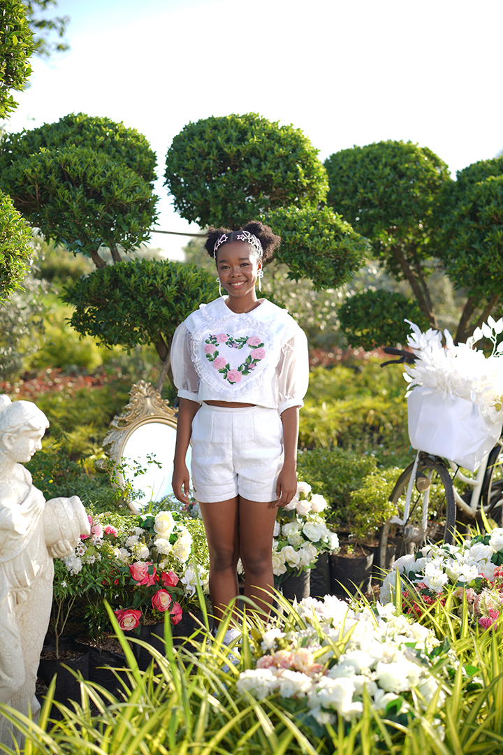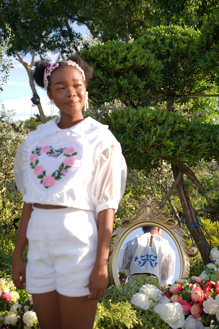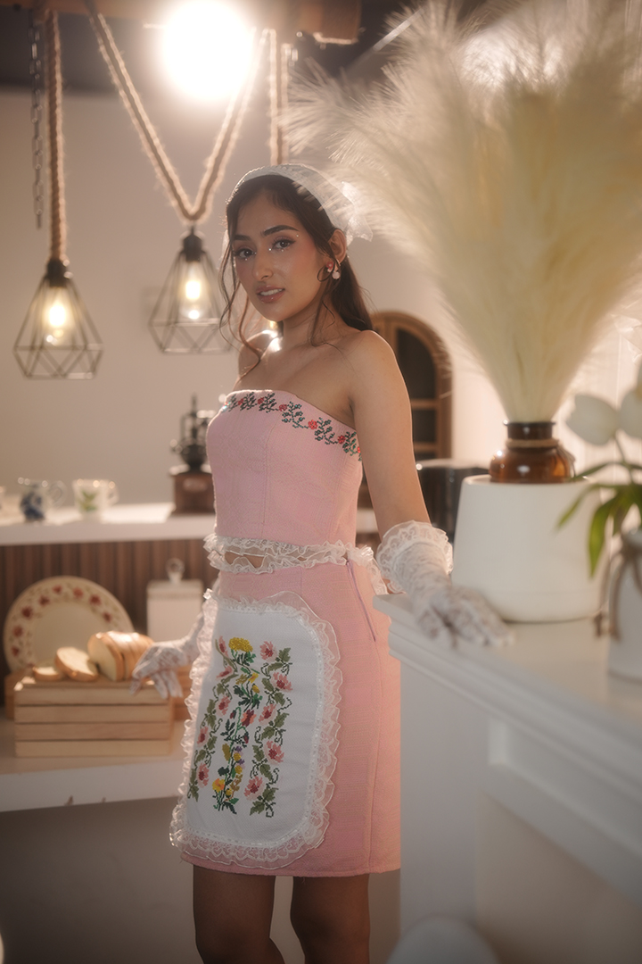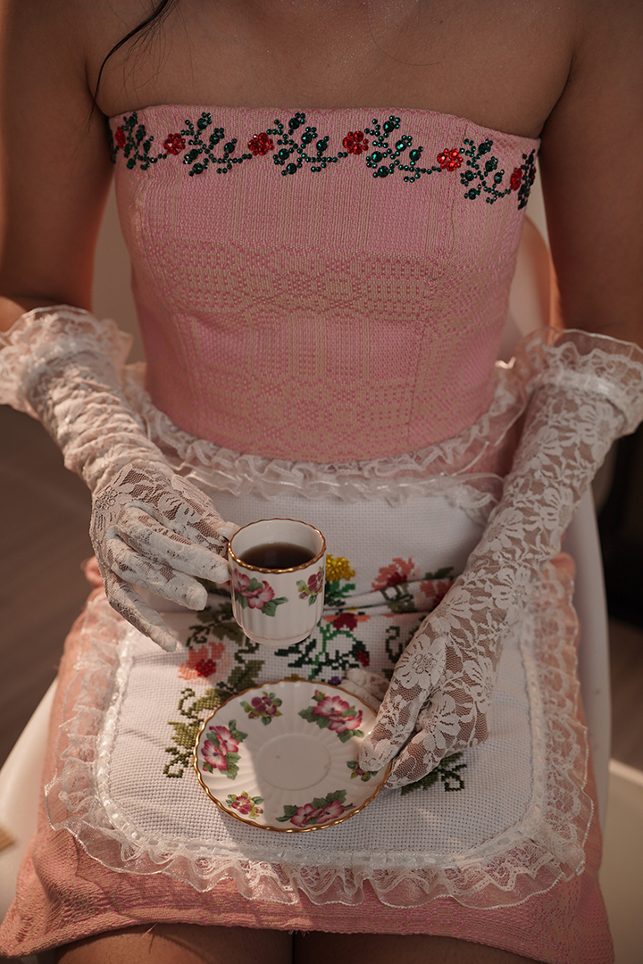 grandmother’s collection of vintage cups and plates, locked in cabinets, symbolized the designer’s feelings of restriction and being sheltered during her puberty. The designs in this collection narrate this emotional journey through feminine silhouettes, ruffles, pleats, cross-stitch details, beadings, and delicate draping, capturing the transition of adolescence. As the collection progresses, the pieces become more structured and ornate, symbolizing the gradual transformation into a graceful young lady."