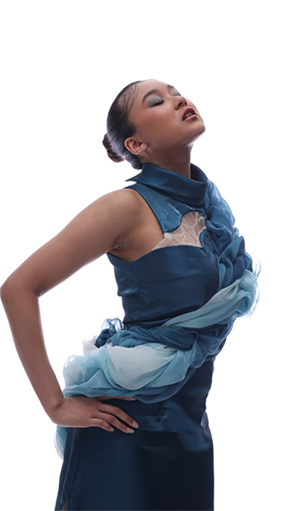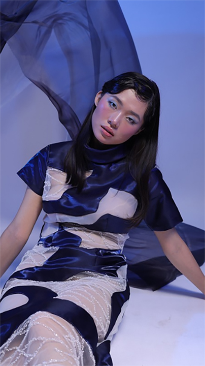 Flowing Within is a collection inspired by the different stages of emotion I experienced throughout college. Like water, these emotions shifted between moments of calm and waves of uncertainty and renewal. Water became both a metaphor for my depression and a reflection of my journey into the virtual world in search of comfort and connection, showing how the digital space can both protect and expose our most vulnerable selves.