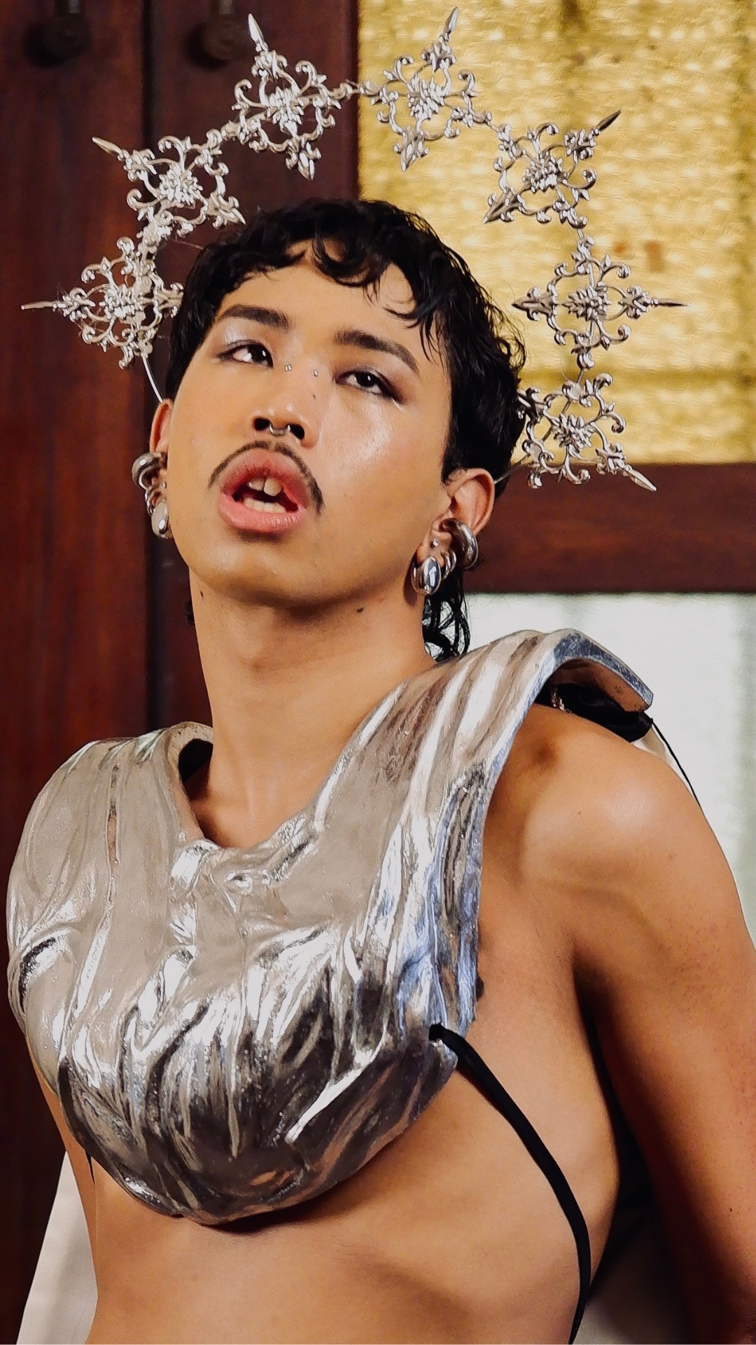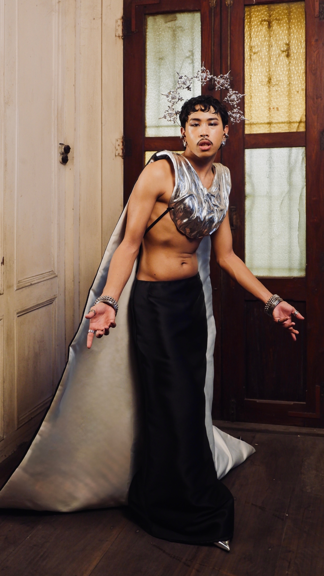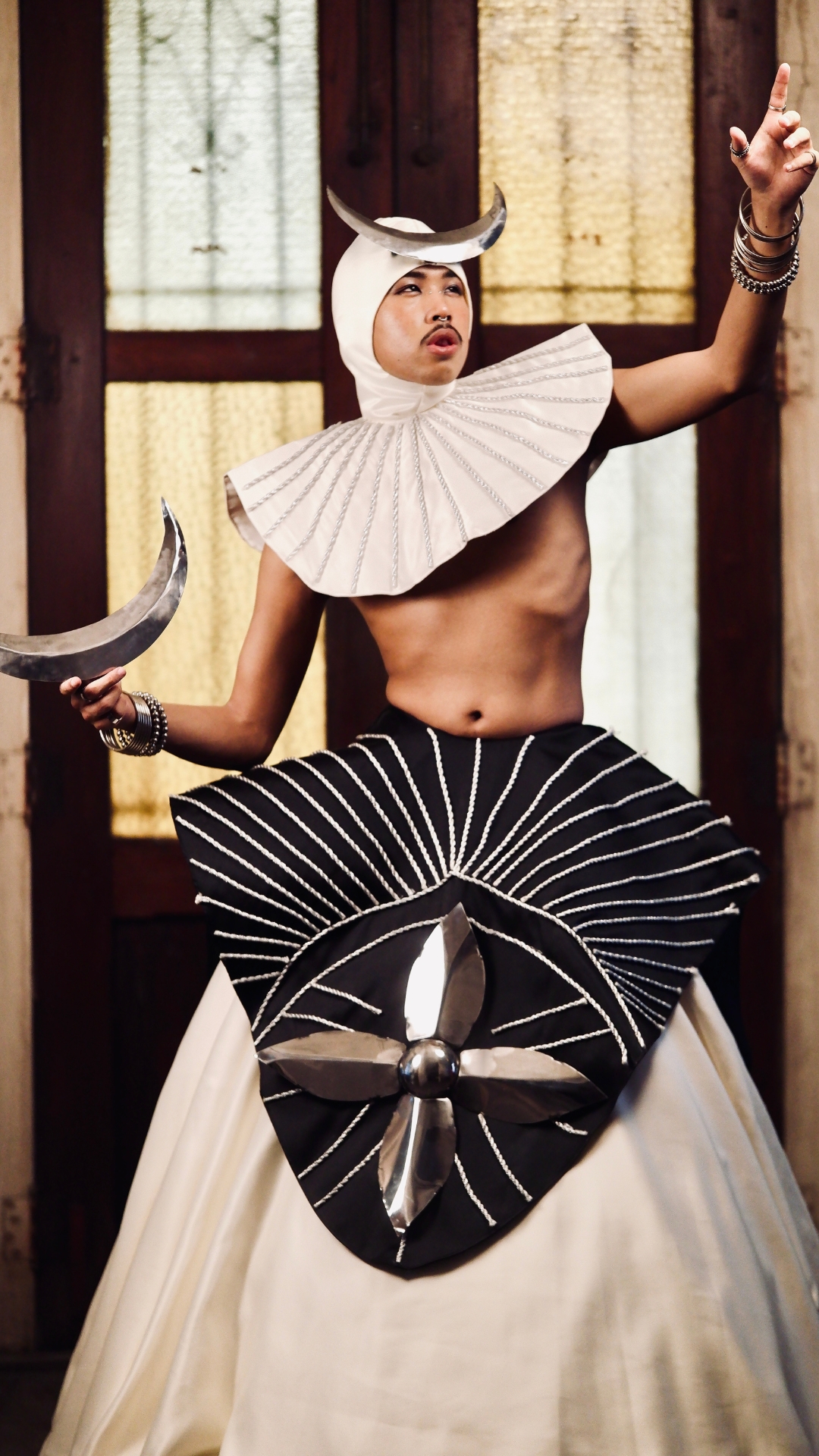 Ginu Ku explores my journey of self deification from being shaped by religion to becoming my own god through fashion. This collection transforms Catholic aesthetics into wearable symbols of empowerment and self-realization. Inspired by Kapampangan traditions and saint vestments, Ginu Ku reinterprets holiness as self acceptance. It reflects my shift from devotion to self-worship, turning religious ritual into personal expression. The collection merges sacred and modern elements to show my transformation from believer to self defined being. By revisiting the Catholic rituals I grew up with, Ginu Ku turns faith into fashion and spirituality into self lcreation. It honors my roots in religion while challenging its idea of perfection through embracing imperfection. Ginu Ku symbolizes my liberation from imposed beliefs, dressing my evolution from faith to freedom. Through saint inspired silhouettes and sacred detailing, the collection embodies my journey to inner divinity. A visual confession of my agnostic awakening, Ginu Ku makes the divine personal, imperfect, and human.