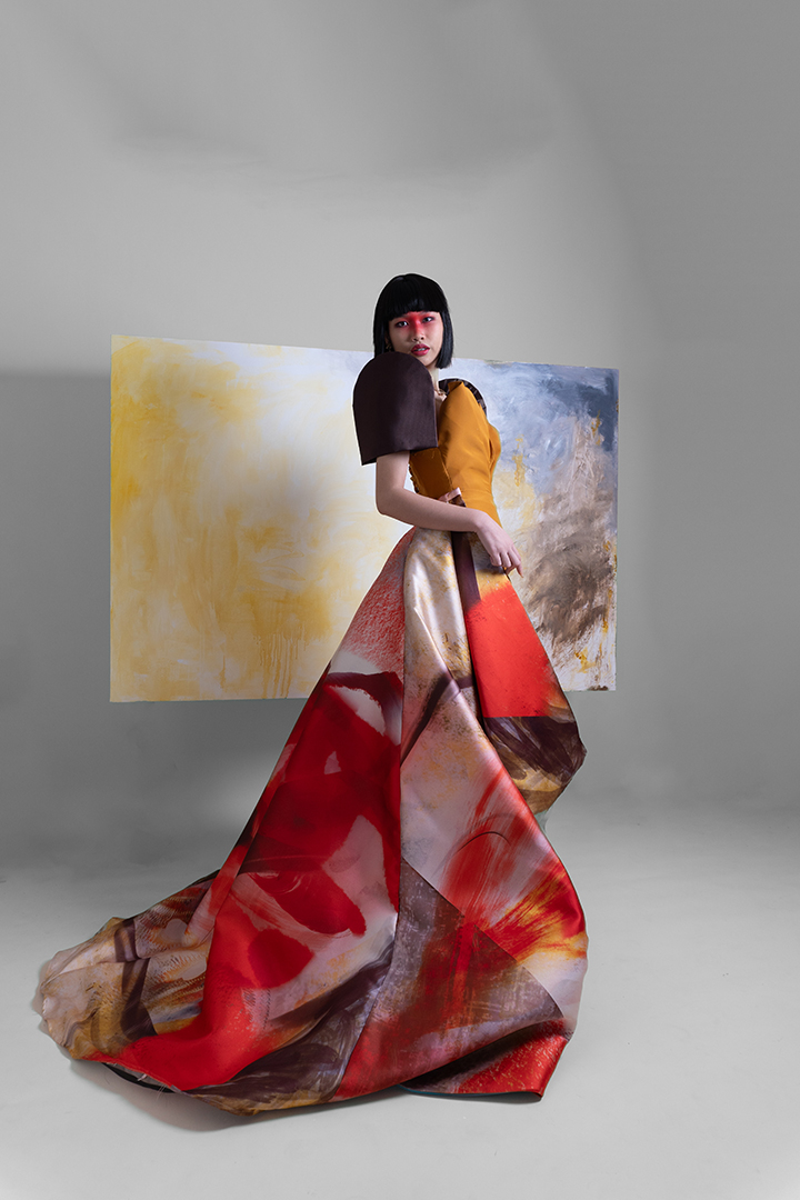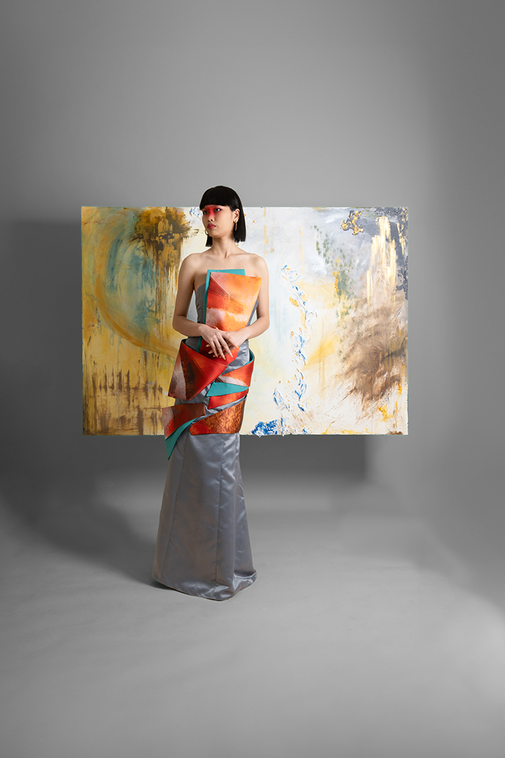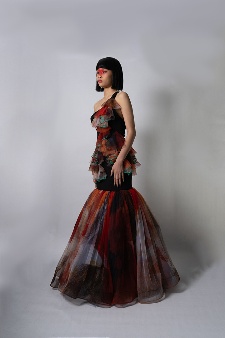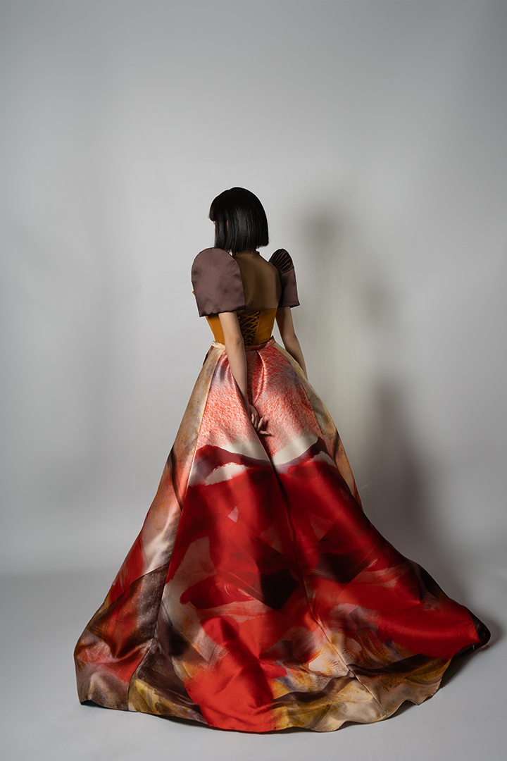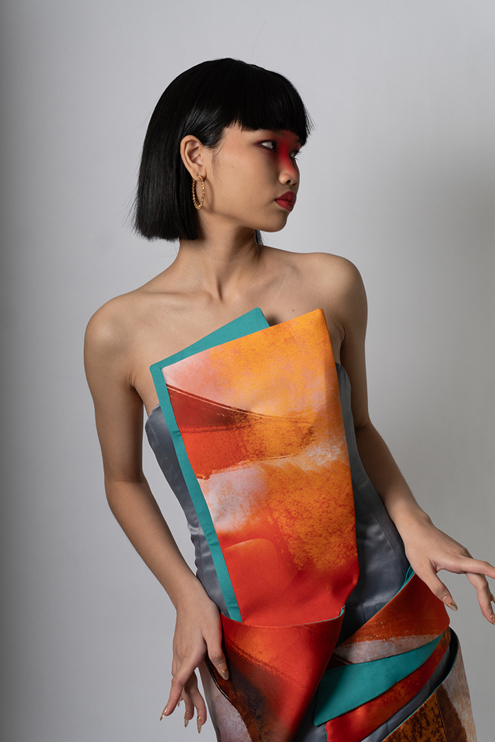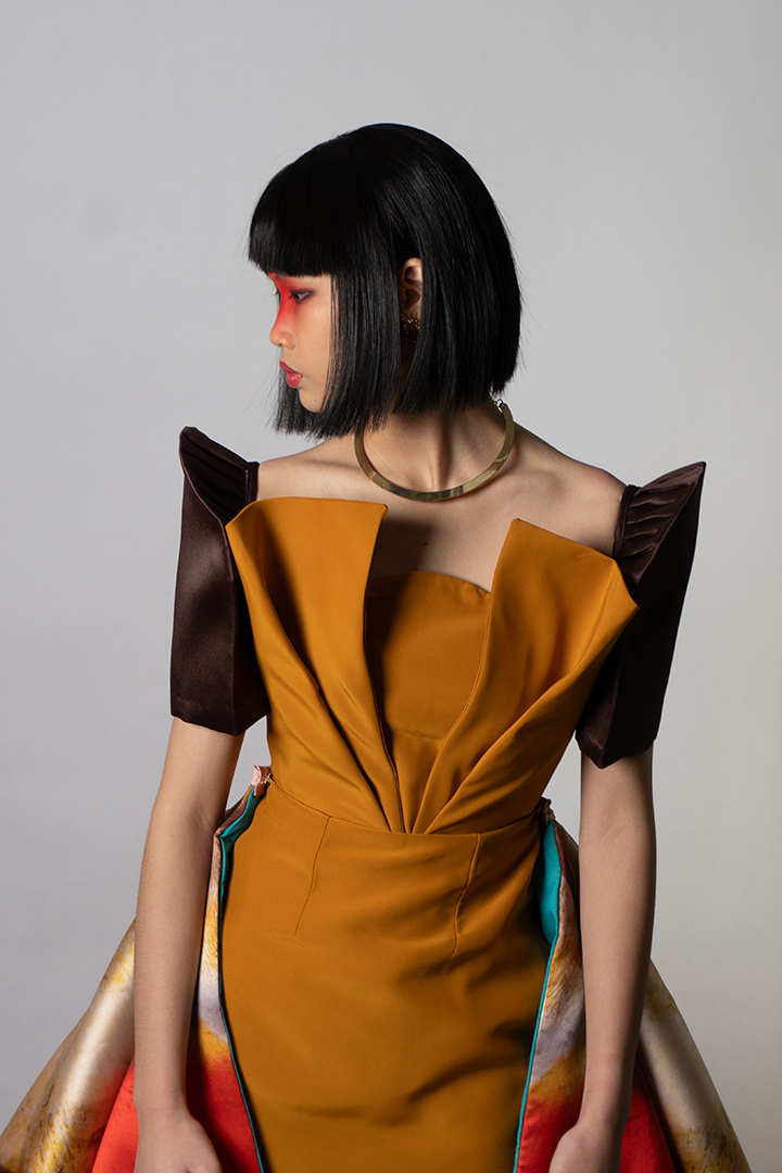 Mangan Ta, kapampangan for “Kain na,” draws inspiration from the process of cooking shrimp; an act of love rooted in Kapampangan traditions and cuisine. It reflects the designer’s exploration of translating personal memories and artistic practice into fashion, while reinterpreting elements from her mother’s capstone collection back in UP Clothing Tech.
