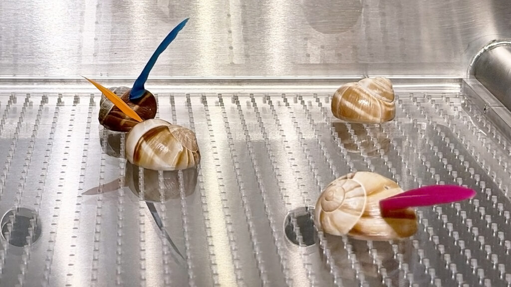 Aki Sasamoto’s Social Sink Microcosm #2 sets shells on a surface where air blows through small holes. The shells slide across and spin according to their shapes. The counterclockwise spiraling shells can be seen as a way to express minority identity, moving against the usual flow. Some shells carry boa feathers that catch the air, making them spin faster. This creates another layer, suggesting that even within a minority group there are differences, and some move with more force than others. The physics here is simple, air pushing against shapes, but the effect is a microcosm of social dynamics. The piece shows how imbalance and variation exist even inside communities that already stand apart.