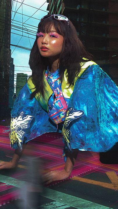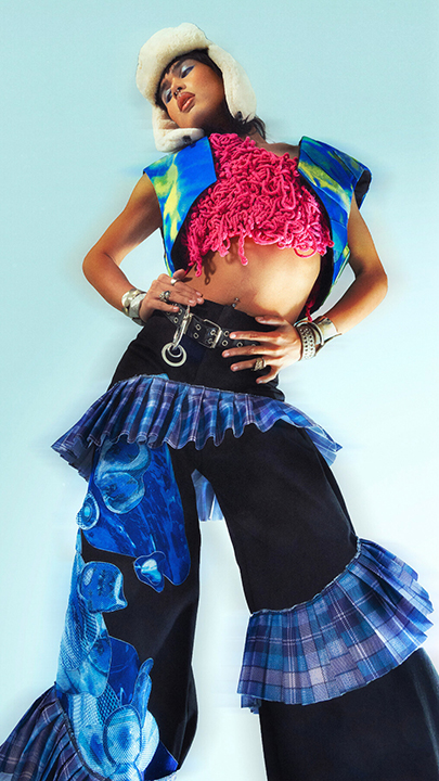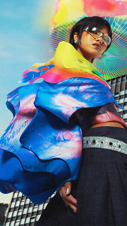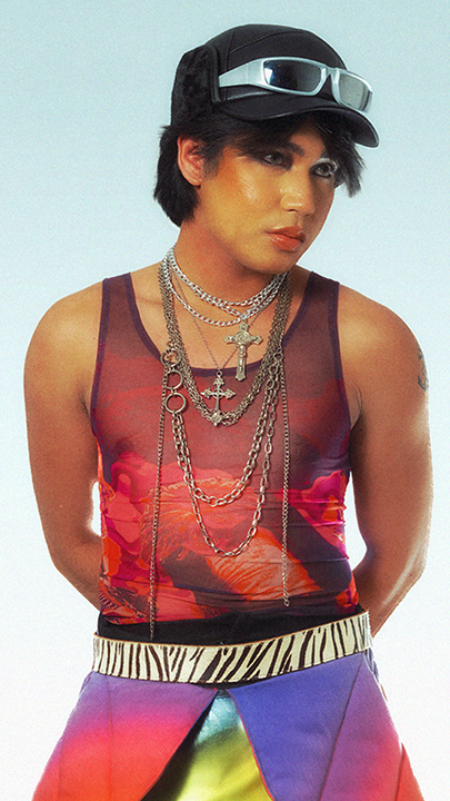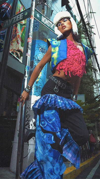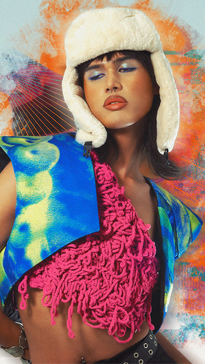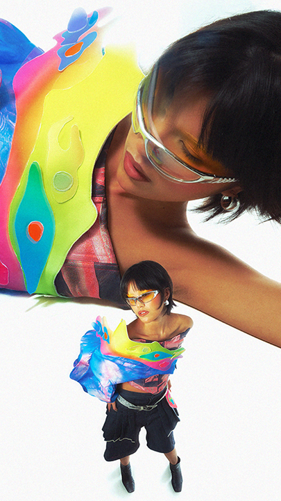 Inspired by traits attributed to monster biology such as mutation and metamorphosis, the collection serves as an analogy for the cathartic celebration of once suppressed Queerness as it plays with fabric manipulation, organic and structural forms, vibrant colors, and visceral, eye-catching graphics to illustrate the same careful chaos that one feels when they finally allow themselves to “mutate” and be seen.