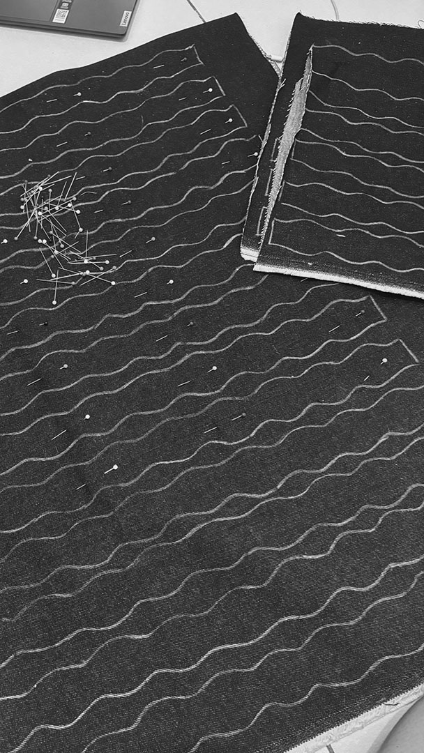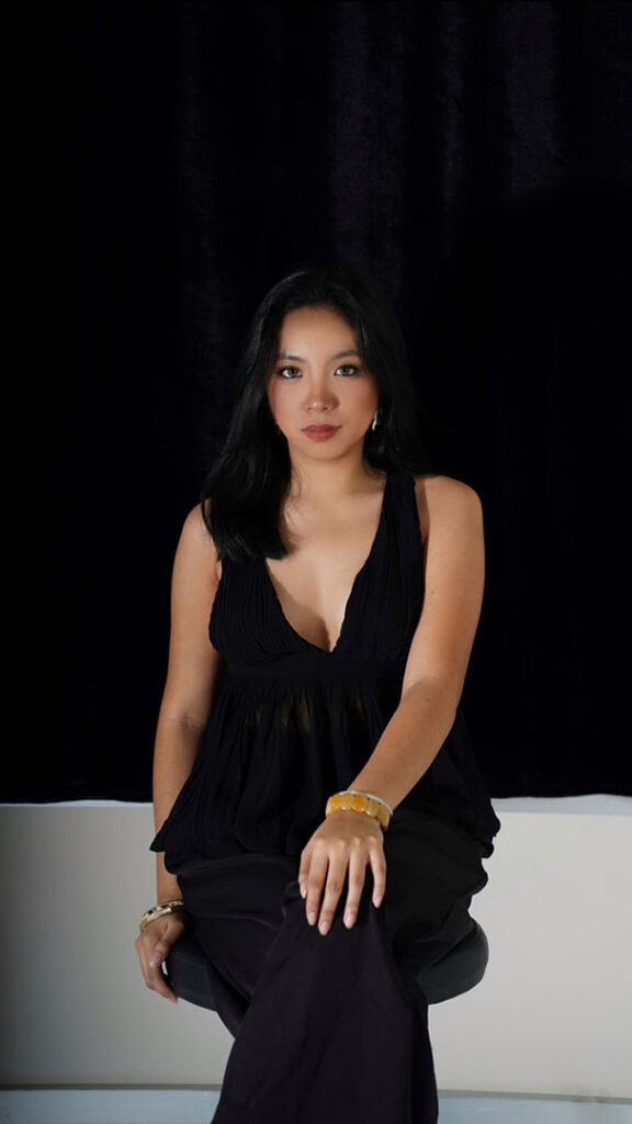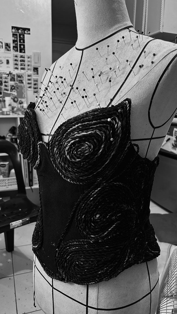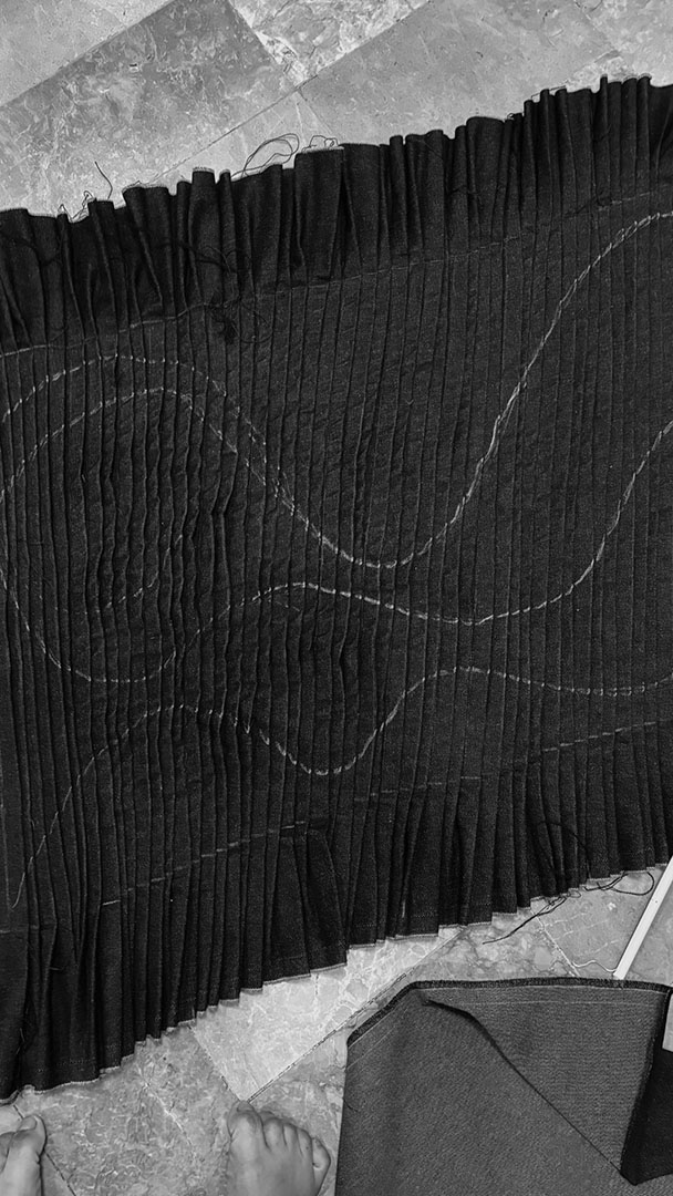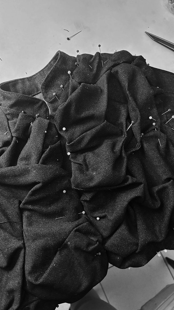 The most challenging part of this collection was the fabric manipulation, as it was extremely time-consuming and required many days just to complete the details. Pushing through it taught me patience, discipline, and the importance of asking for help, especially during the hand-sewing process, where support became essential. This experience also made me more aware of how time management directly affects the execution of complex designs. Throughout the collection, the skill I refined the most was draping, as it played a crucial role in shaping the silhouettes of my garments. Repeatedly working with draping allowed me to better understand form, balance, and how fabric behaves on the body.