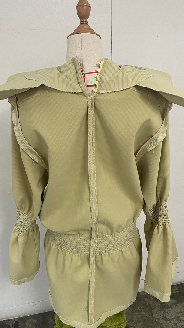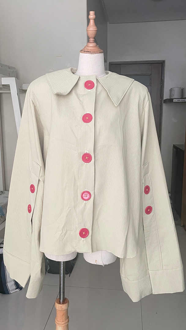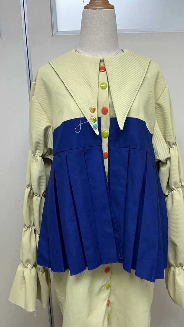 “Growing Pains” is a collection exploring the complex relationship between girls and women, and the emotional tension in between. It reflects the mutual admiration between mothers and daughters—young girls raiding mom’s closet, mothers mirroring their daughters’ style. This closeness entangles, becoming clumsy and messy, as the desire to reflect one another blurs their differences. Oversized silhouettes express the awkwardness of growth, while playful beads, buttons, and bright colors highlight the collision of youth and age.