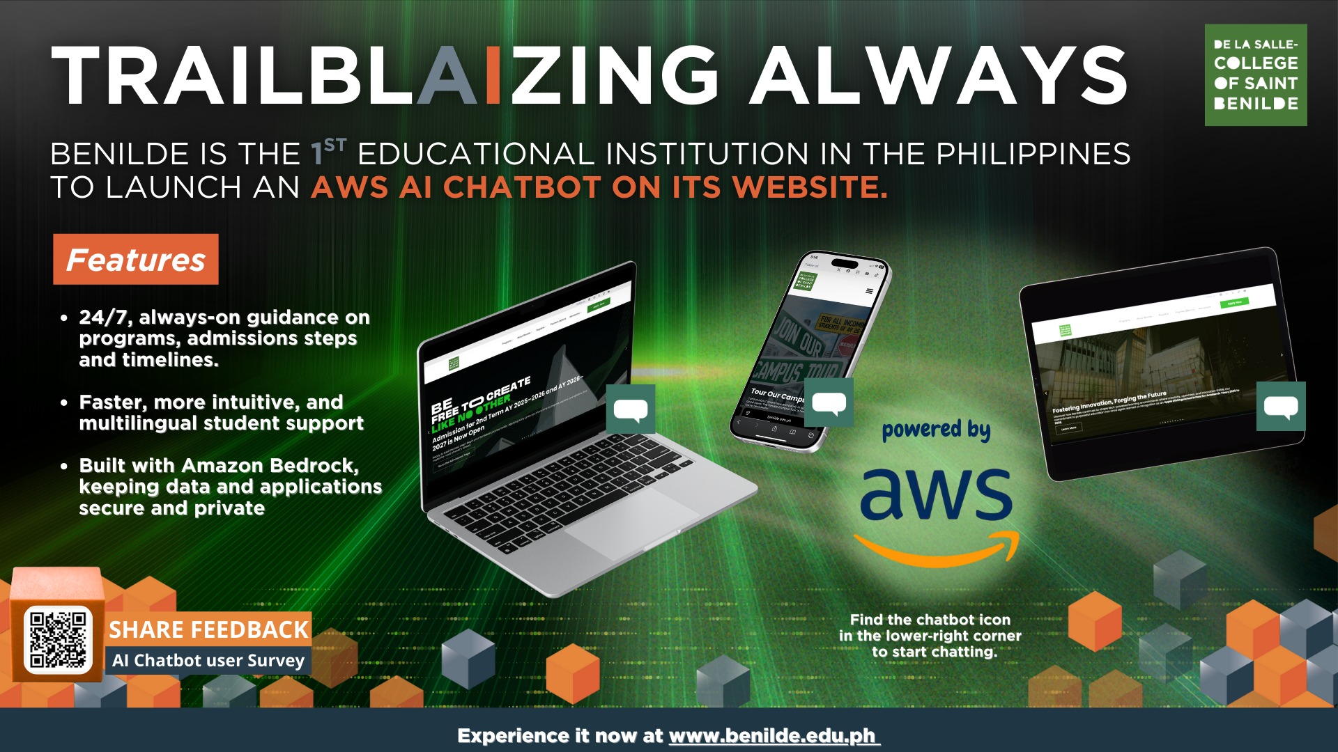 Benilde’s new AI‑powered chatbot, launched on December 15, is now available on the official website. The chatbot provides round‑the‑clock support and responds in English, Tagalog, and Taglish.