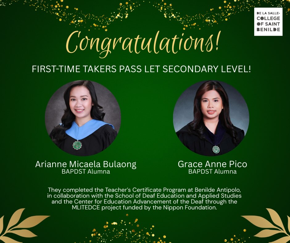 As graduates of the Benilde School of Deaf Education and Applied Studies (SDEAS), they went on to complete the Teacher’s Certificate Program at Benilde Antipolo in collaboration with SDEAS and the Benilde Center for Education Advancement of the Deaf, through the MLITEDCE Project funded by The Nippon Foundation.
