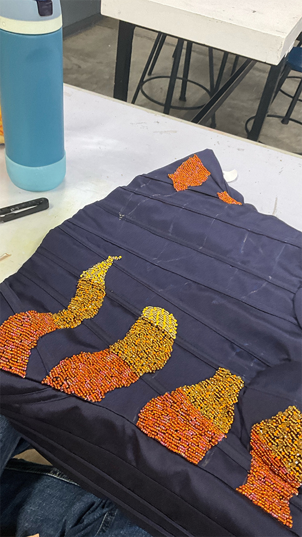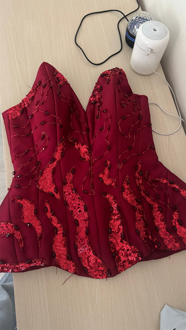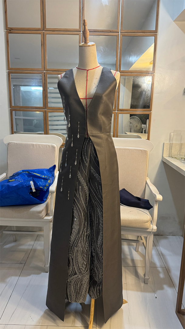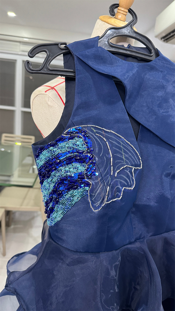 Designing this collection challenged me most in developing a concept that truly represented me since many ideas worked in my head but didn’t translate smoothly into reality, which pushed me to constantly revise my concepts, fabrics, and details throughout the process. While difficult, this taught me to trust myself and realizing that every collection holds a different meaning for each creator. By the end of my thesis, I understood that I was capable of creating something strong and meaningful, and that what is meant for you will come together in its own time. The process was the beadwork, which was entirely handmade and became the most personal and rewarding part of my designs. This is also the process I want people to see the most, as the beadwork represents not just embellishment, but my dedication, growth, and belief in my own abilities—especially since I never imagined at the beginning that I could create something so intricate. I hope that through my collection, people realize that imagination is not just an escape from reality, but a bridge that connects us to endless possibilities.
