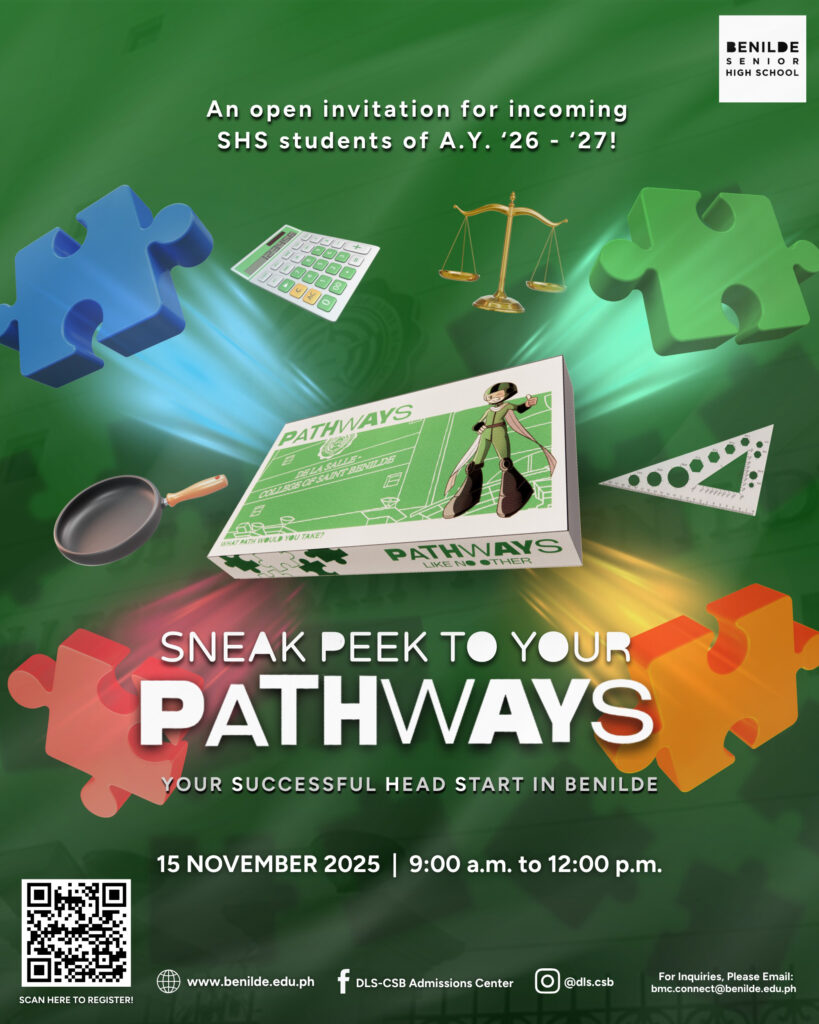 Grade 9 and 10 students are invited to join this free virtual event on Saturday, November 15 from 9:00 AM to 12:00 PM. Discover Benilde’s Senior High School pathways, explore student life, and learn what it means to be part of a DepEd Pilot School. Enjoy early access to enhanced curriculum, hands-on training, and global learning experiences. Sign up now for a chance to learn, connect, and win exciting raffle prizes.