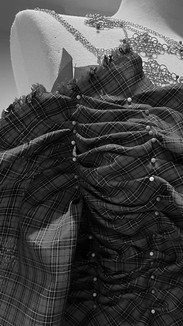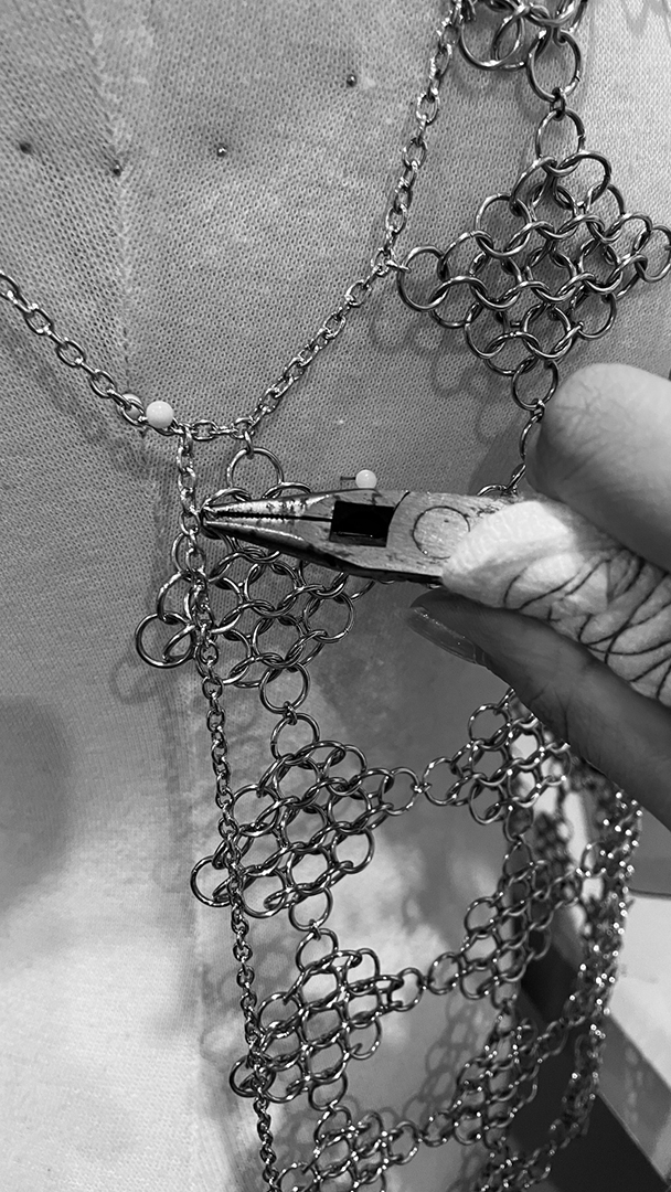 The collection reimagines strength by drawing inspiration from women condemned as witches during the Medieval and Renaissance eras—those who defied societal norms and endured brutal punishments. By referencing historical torture practices, the design transforms chains and metal from oppressive tools into powerful symbols of rebellion and defiance. A contemporary twist is introduced through the use of businesswear fabrics such as gabardine, Armani wool, and polyester, bridging the gap between the past and the empowered, modern-day girl boss.