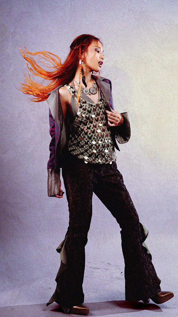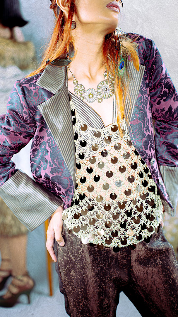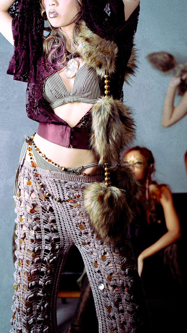 Through clothing as an act of escapism, SPECTACULA invites dreamers of the unconventional to transcend the ordinary and awaken their larger-than-life personas. Inspired by the transformative energy of 1970s rock musicians, the collection celebrates androgyny, glamour, and the art of becoming—inviting its wearers to step into imaginative personas and bring their boldest selves to life. Like putting on a mask, not to hide behind it, but to perform for the audience.