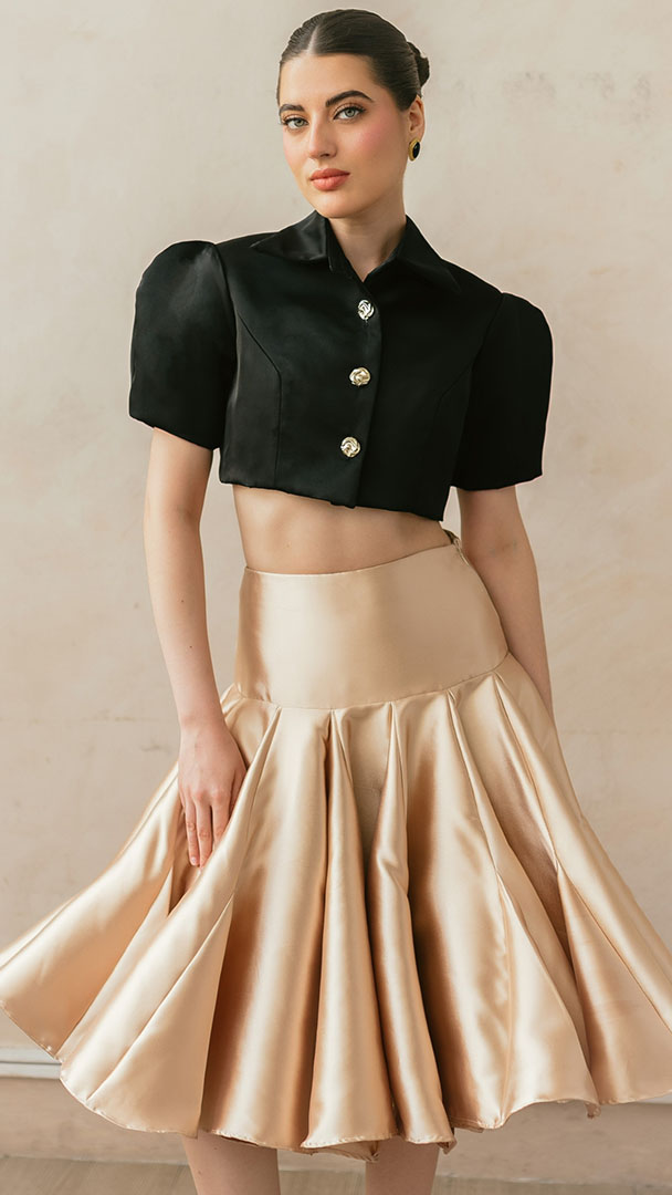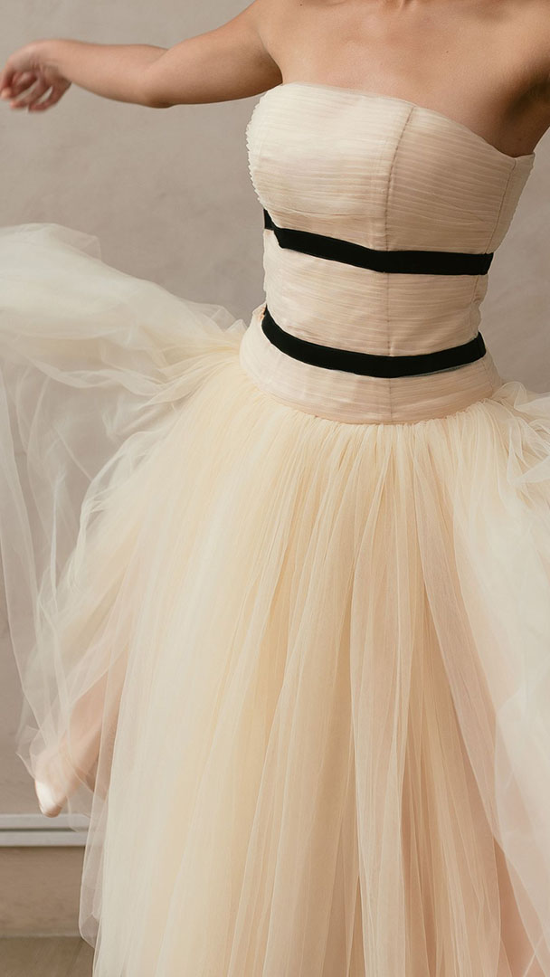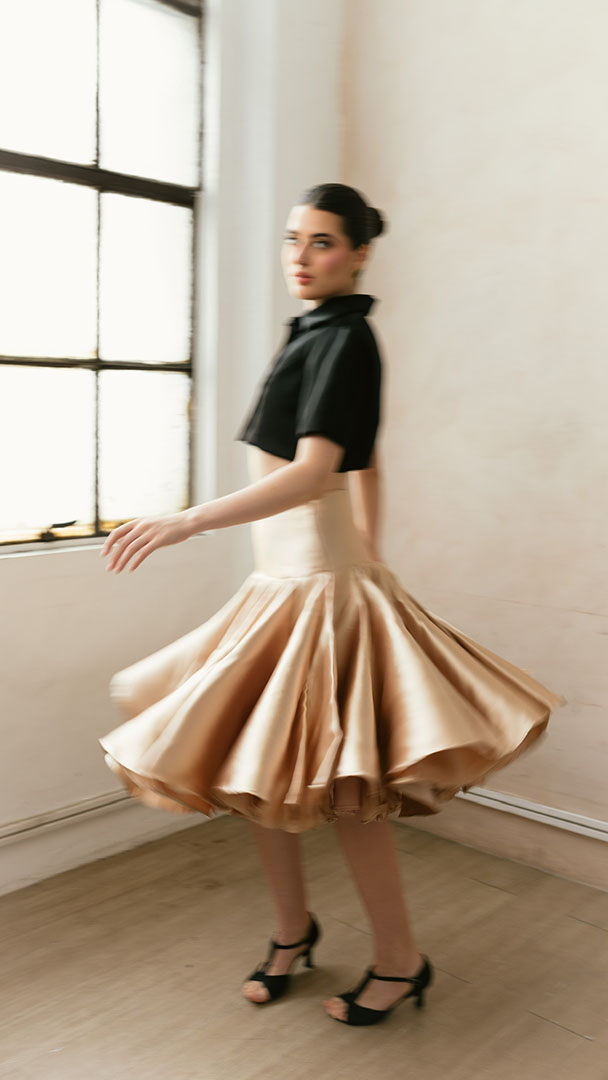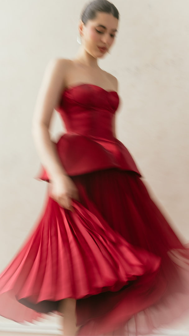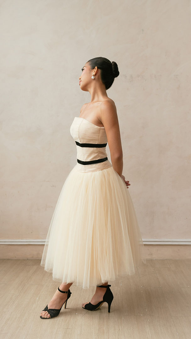 Tethered Grace is a contemporary reflection on the delicate tension between restriction and movement. A story stitched in contrast of women once bound by expectation, now moving with intention. Rooted in the sculpted silhouettes of 1950s fashion, this collection reimagines an era of restraint through a modern lens.