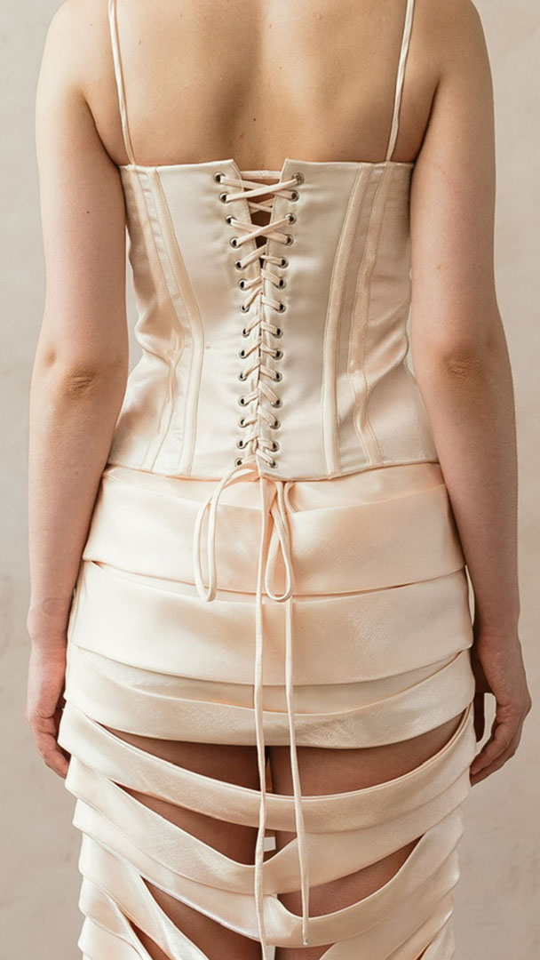 The collection draws from the experiences of women in the 1950s, a time that celebrated elegance yet imposed conformity. It contrasts the structured, restrictive shapes of the past with the expressive, dramatic forms of today. Fitted corsets and tailored bodices echo the control and precision of the era, while bold silhouettes and fluid details embody the freedom and individuality of the modern woman. A quiet exchange between the past and present, it is a visual reflection on what it meant to be a woman then and what it means to be now.