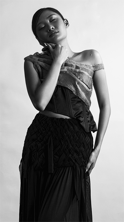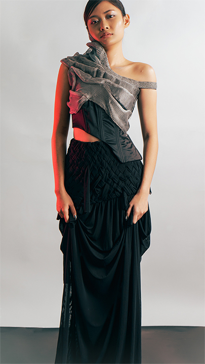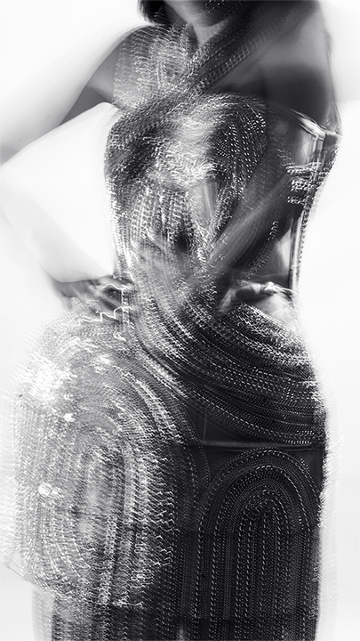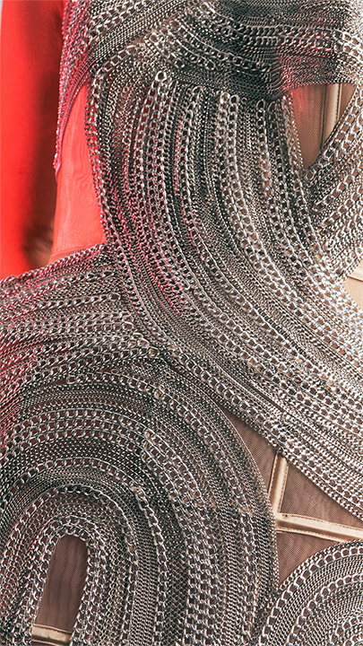 The Armor Paradox posits that to don armor is to battle against the self’s destruction, but in doing so, we put it and ourselves on the path to erosion. Through asymmetry, distortion, and the integration of metal into traditionally soft crafts, the garments embody collapse and persistence at once: armor as strength, armor as decay. In a culture of acceleration, in this dog-eat-dog world, everything that is given up— time, identity, even the self, can be expendable in the pursuit of something greater. We chase greatness because we fear insignificance. In this quest to become larger than life, to surpass the human, we are driven by the most human of fears: that without our armor, we might be nothing at all.